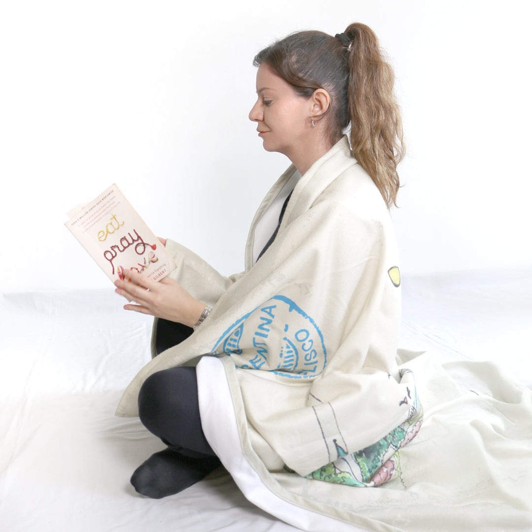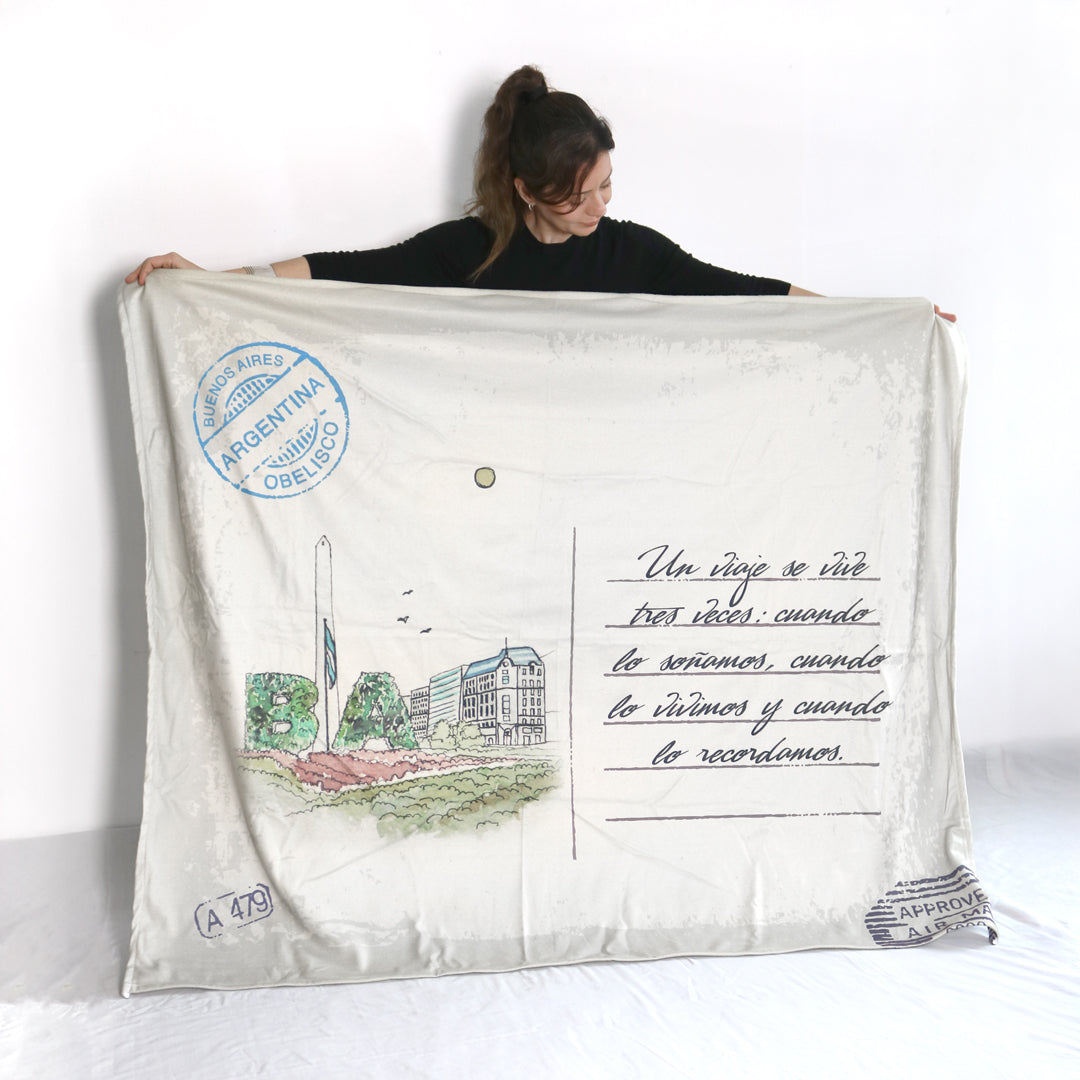 Esta manta con mensaje personalizado está diseñada como si fuera una carta postal: incluye una dedicatoria impresa, como si la hubieras enviado desde tu lugar favorito del mundo.