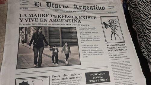 Como si fuera la tapa de un diario argentino, esta frazada trae una nota principal que podés personalizar con tu foto y con el mensaje que quieras. El resto del periódico está compuesto por letras en latín o al azar, que no se editan ni tienen intención de significar algo.
