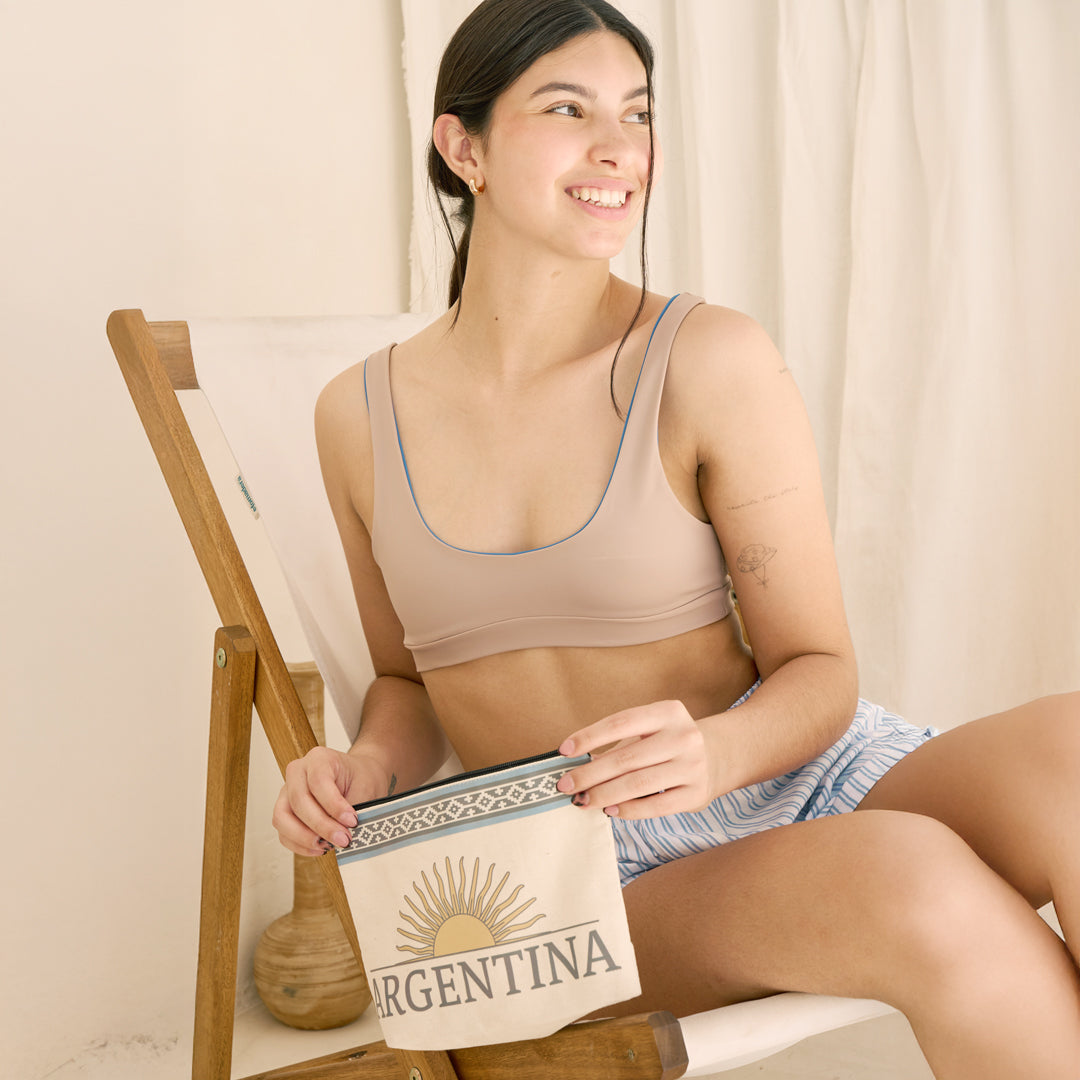 El Neceser Argentina Sol combina diseño cultural y funcionalidad. Confeccionado en lienzo resistente, luce el sol argentino y guardas típicas del norte, evocando nuestras raíces.