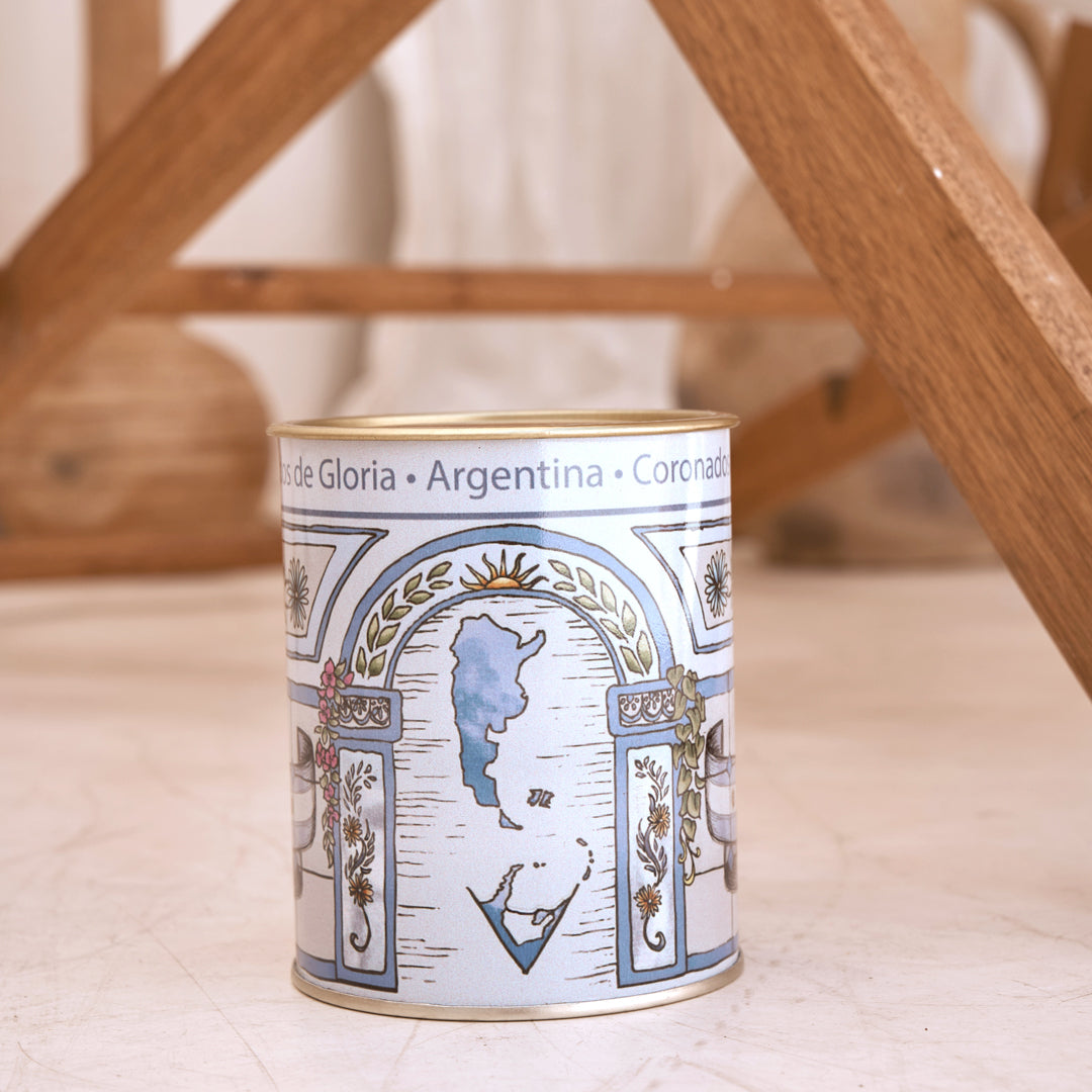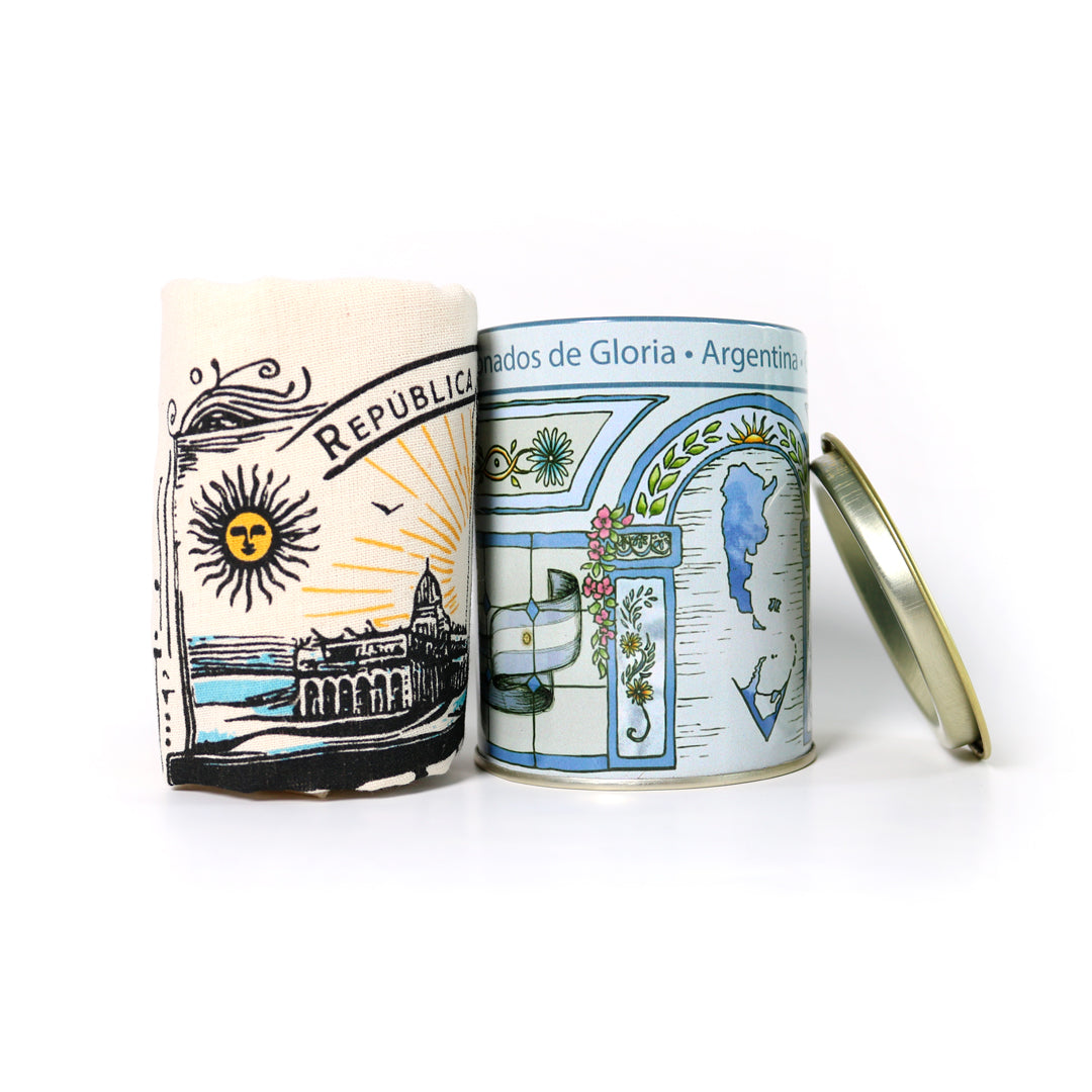 Bolsa de tela de lienzo 100% Algodón. Viene presentada en una lata de hojalata coleccionable, ideal para regalar o llevar siempre con vos.